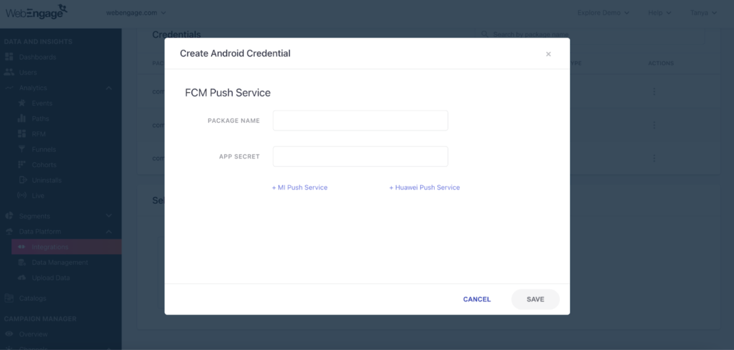 We have an added integration for Xiaomi and Huawei push services on the WebEngage dashboard. To get started, update your respective push credentials on the Integrations page. Refer to our developer documents on how to integrate Xiaomi and Huawei push services on your dashboard.