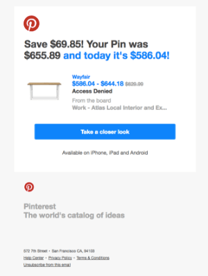 They are not just reminding the client that they have a product in their cart or on their wish list; they also notify the user when the product’s price gets lower! This way, Pinterest creates value for their customers and keeps them interested in the sale.