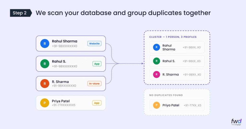 WebEngage scans all profiles and groups those sharing the same attribute value into a cluster. For example, if three profiles all have the phone number +91-98XXXXXXX0, they form a cluster of three.