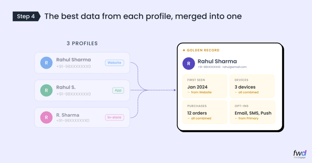 Intelligent Deduplication is a capability in WebEngage that scans your entire user base, identifies profiles that share common properties (like phone number or email), groups them into clusters, and merges them into a single, unified profile – the Golden Record.