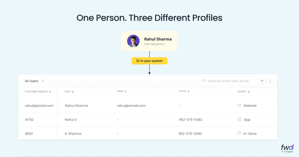Over the years, we’ve seen this play out across hundreds of our customers. Thanks to multiple workflows and touchpoints in any real business, their user data streams are almost never coherent across data sources. And this trickles downstream to systems, including WebEngage. A user signs up on your website, downloads your app, walks into your store, and more often than not, you’re looking at three “different” users in your system who are actually one.
