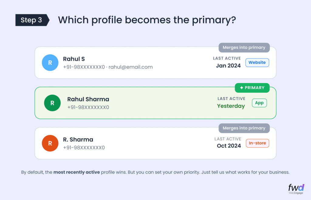 Even this selection is flexible. For example, if you’re a bank, your in-person registration probably captures KYC documents and verified identity, while your app signup only collects a name and phone number. In that case, you’d want to keep the in-person profile as primary, even if the app profile was active more recently.