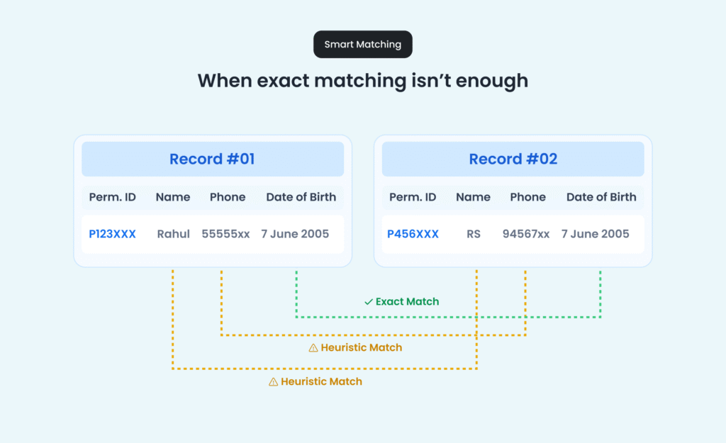 Exact matching, like the above, is just the starting point. Real-world data is messy. Phone numbers have typos, names are spelled differently across systems, and the same person might be “Rahul Sharma” in one record and “R S” in another. For cases like these, the system goes deeper. It looks at multiple signals together, whether IDs match, whether age and phone numbers are consistent, and even whether names are approximately the same. Only when enough signals align does it treat two profiles as the same person.