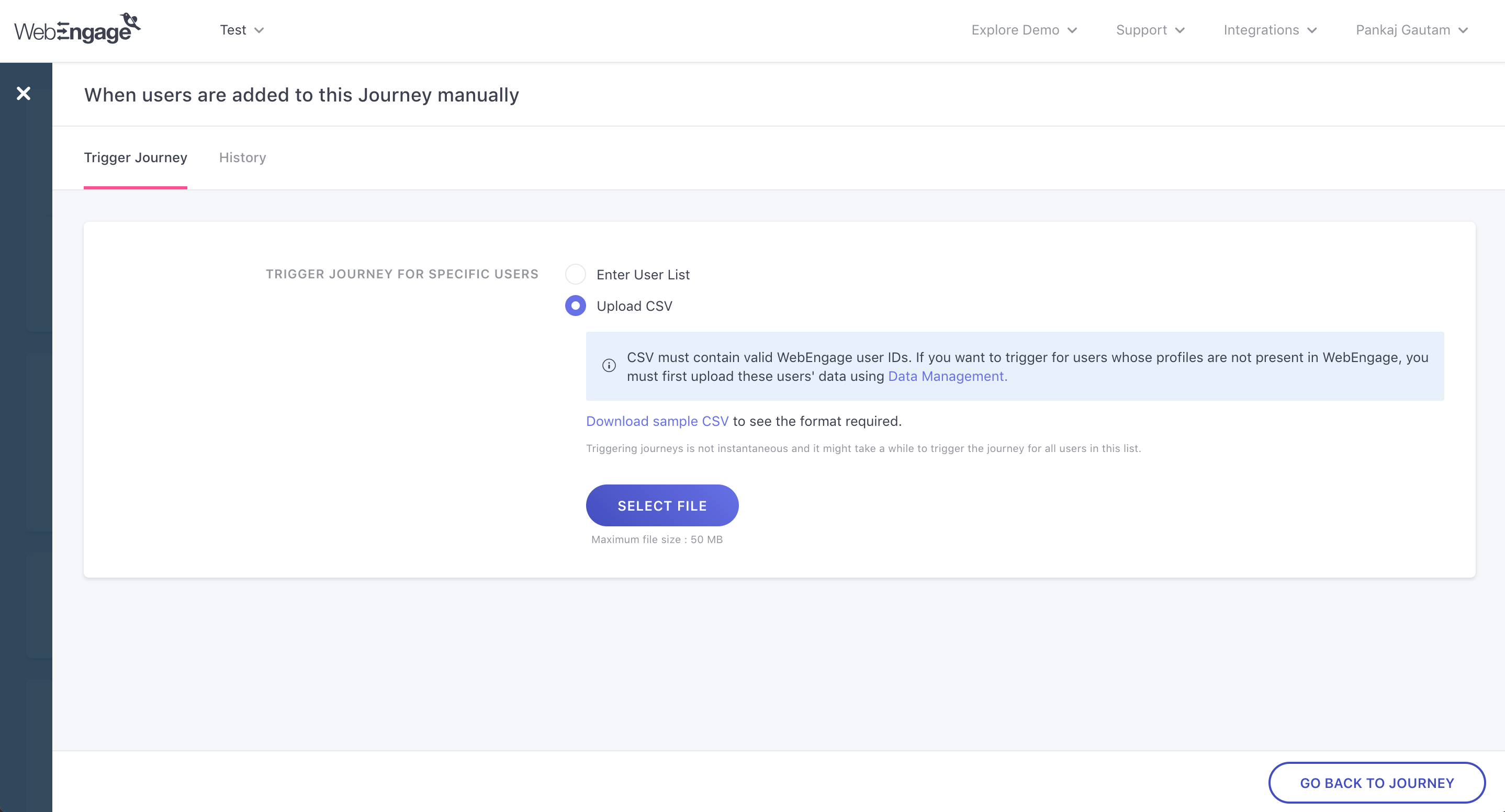 You can now upload CSV files to trigger a journey for a specific set of users. Previously, you had to copy paste the user IDs in order to trigger the journey for these users. The new update makes it easy for you to upload a list of users.