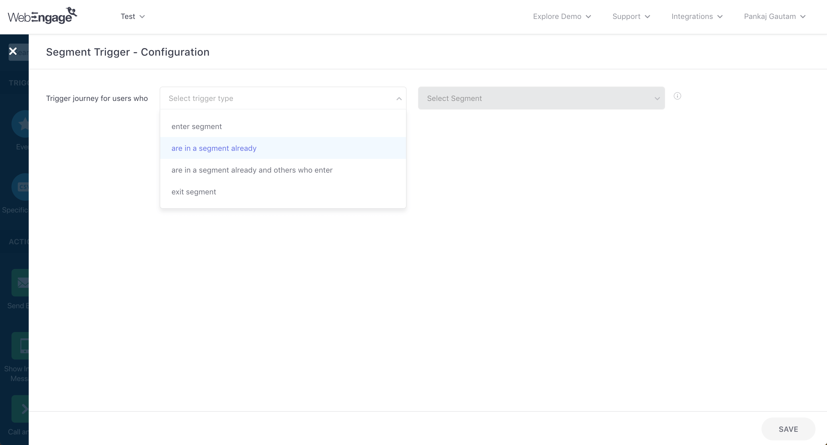 Journeys can now be triggered for users who are already in a segment in addition to the users who enter or exit a segment. Previously, journeys could be triggered only for users who enter or exit a segment.
