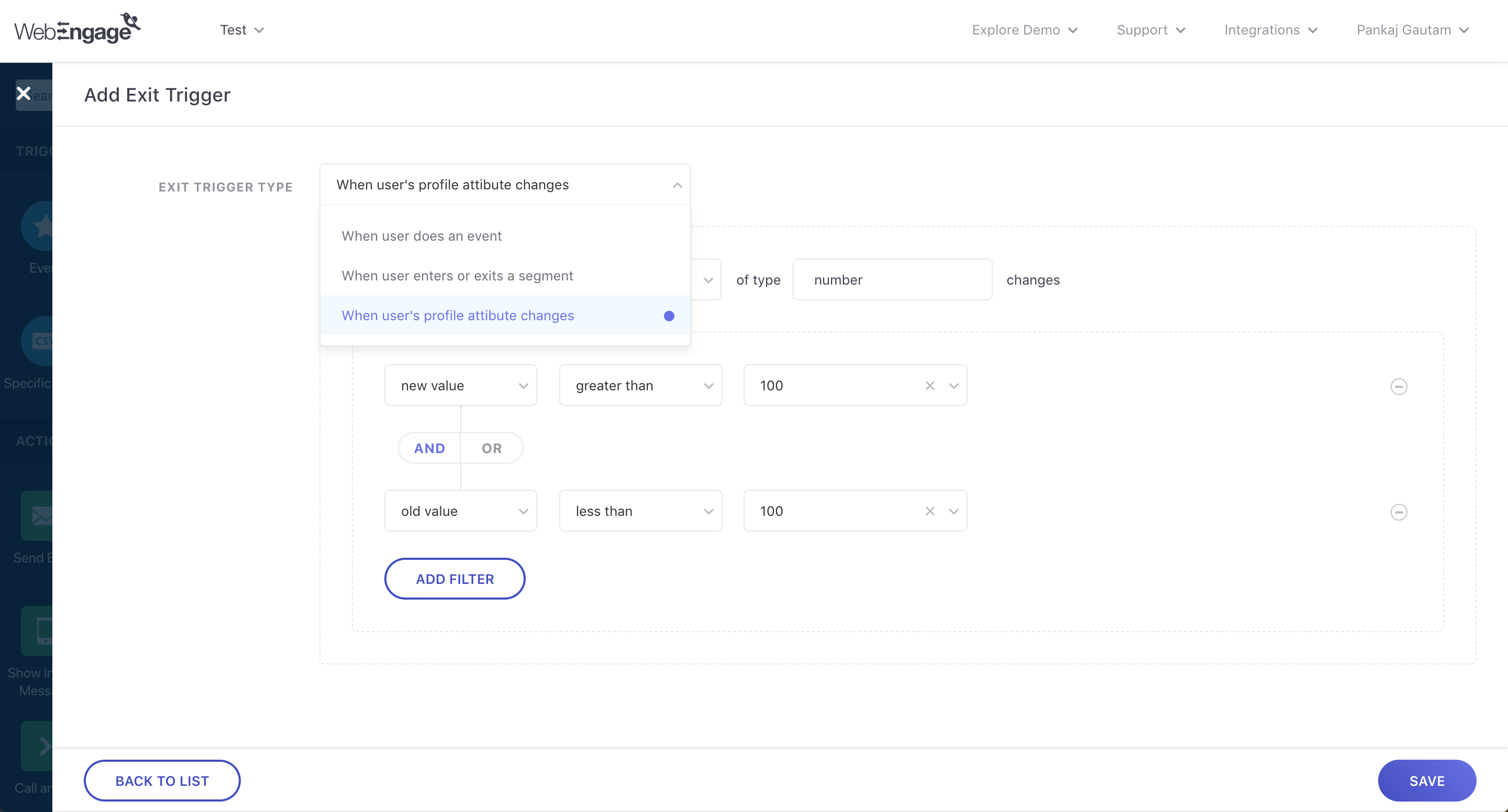 You can add two more types of exit triggers to journeys: (1) When user enter or exits a particular segment (2) When a user’s profile attribute changes eg. exit journey for a user whose category changes from Silver to Gold. Previously, exit triggers only covered specific events done by a user.