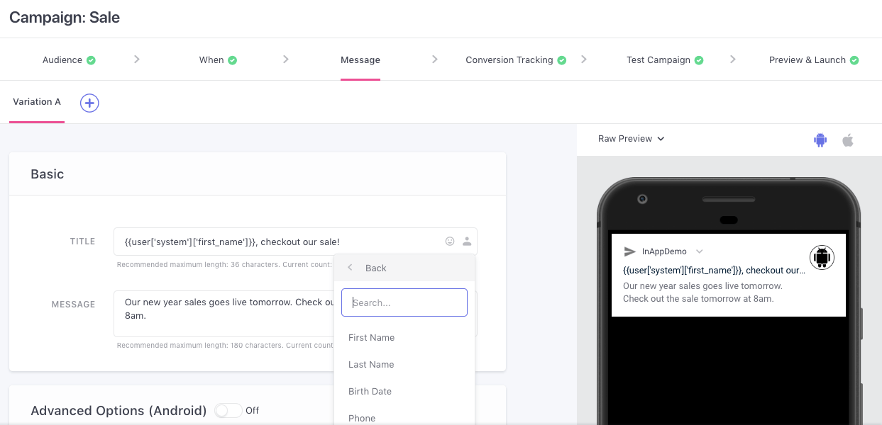 We have added a search box in the personalization menu in the campaign creation process so that it becomes easy for you to search for an event, event attribute or user attribute when adding personalization tokens in your campaigns.