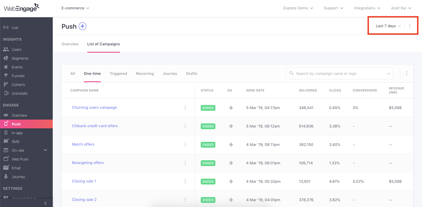 List of Campaigns and Campaign > Overview, Analyze now have a calendar / time period selector (on the top right) so that you can view campaign results for only that time period. On the List of Campaigns page, the time period has been set by default to Last 7 days (you can change this to Last 30 days, Last 90 days etc.). In case a campaign did not record any open, click etc. in the last 7 days, the metric for that campaign will show 0 in the list page. Please note that all your campaigns continue to be visible on the list page as was the case before.