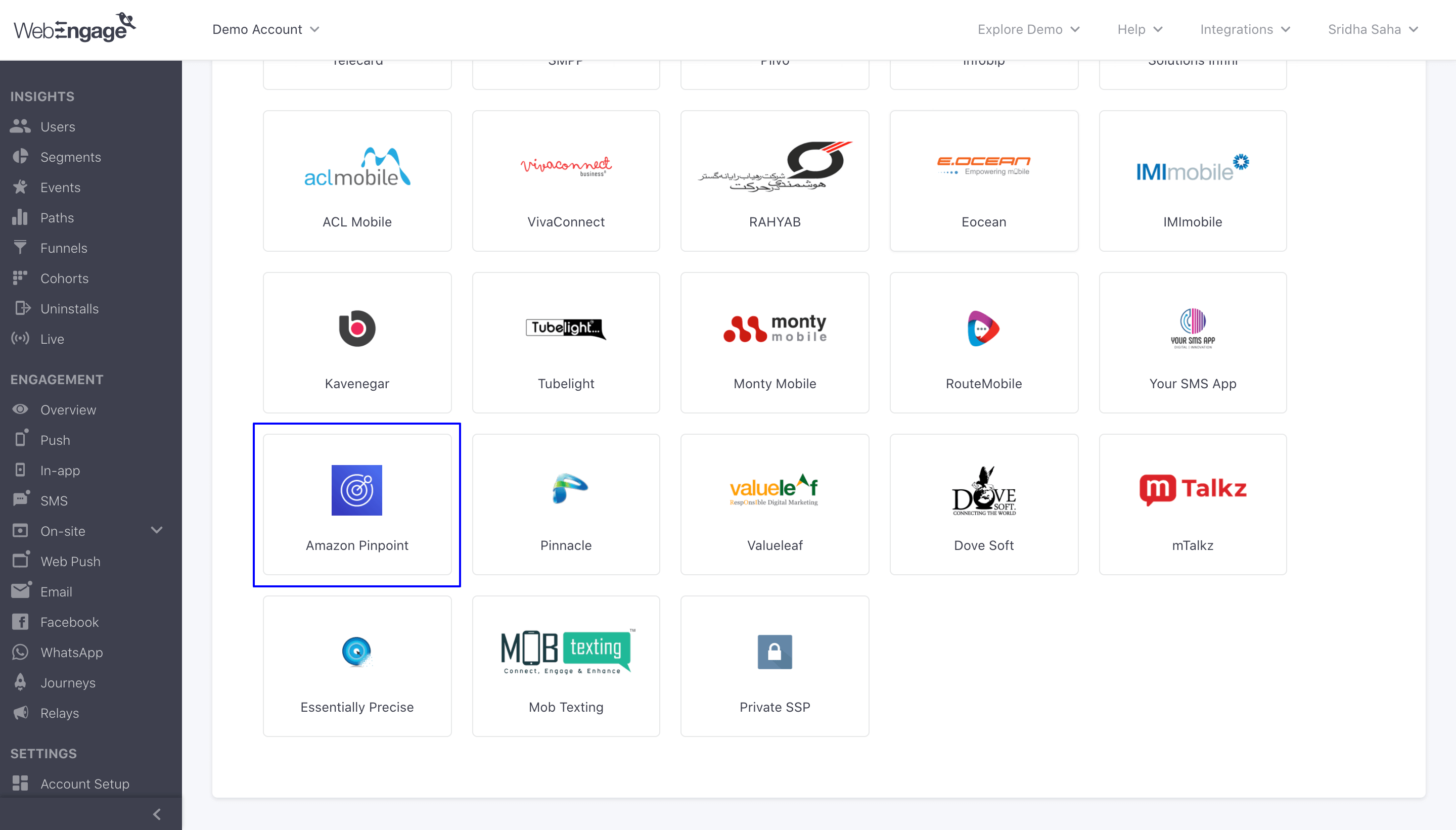 Along with the 32 other SSPs, we have also brought in AWS Pinpoint as our SSP partners. This means you can now send highly personalized SMSes to your end-users using AWS Pinpoint as a service, from your WebEngage account. Please check the docs to know how you can set up AWS Pinpoint as a service while using SMS as a channel.