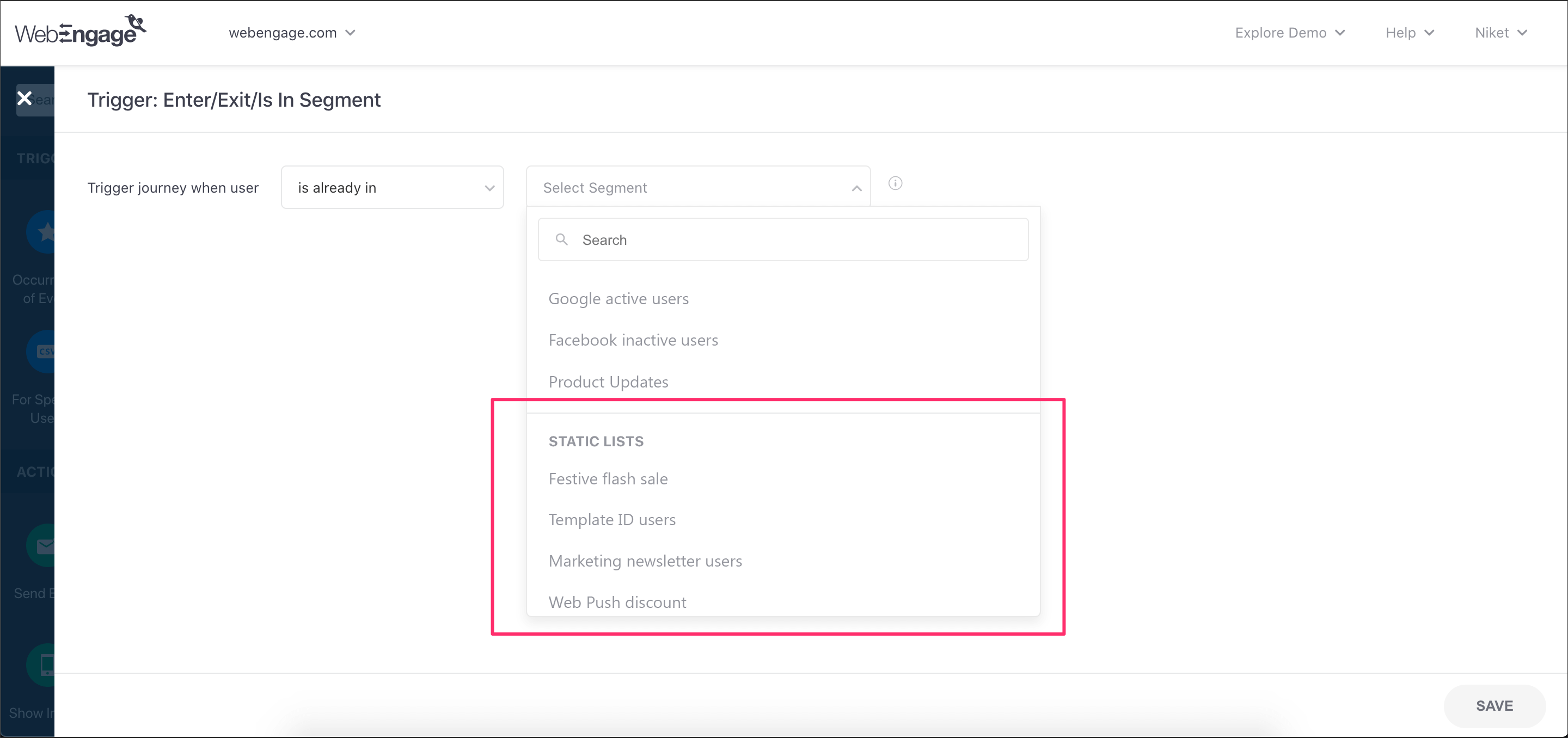 You can now use Static Lists to trigger journeys on WebEngage. The ‘Segment Trigger Block‘ in journeys now lets you select Static Lists as well, helping you create more high-value and contextual drip campaigns for your customers. This will be visible in the Select Segment dropdown when the ‘is already in‘ condition is selected.