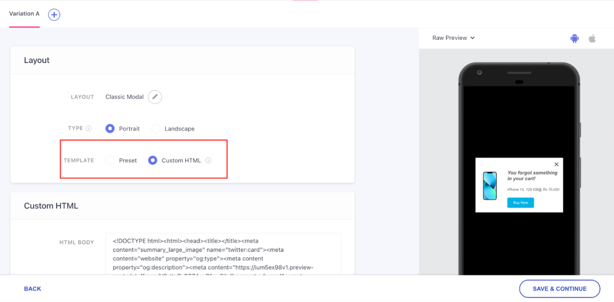 Using the newly introduced “Custom HTML” option, you can create more engaging in-app notifications by having full control over its look and feel.