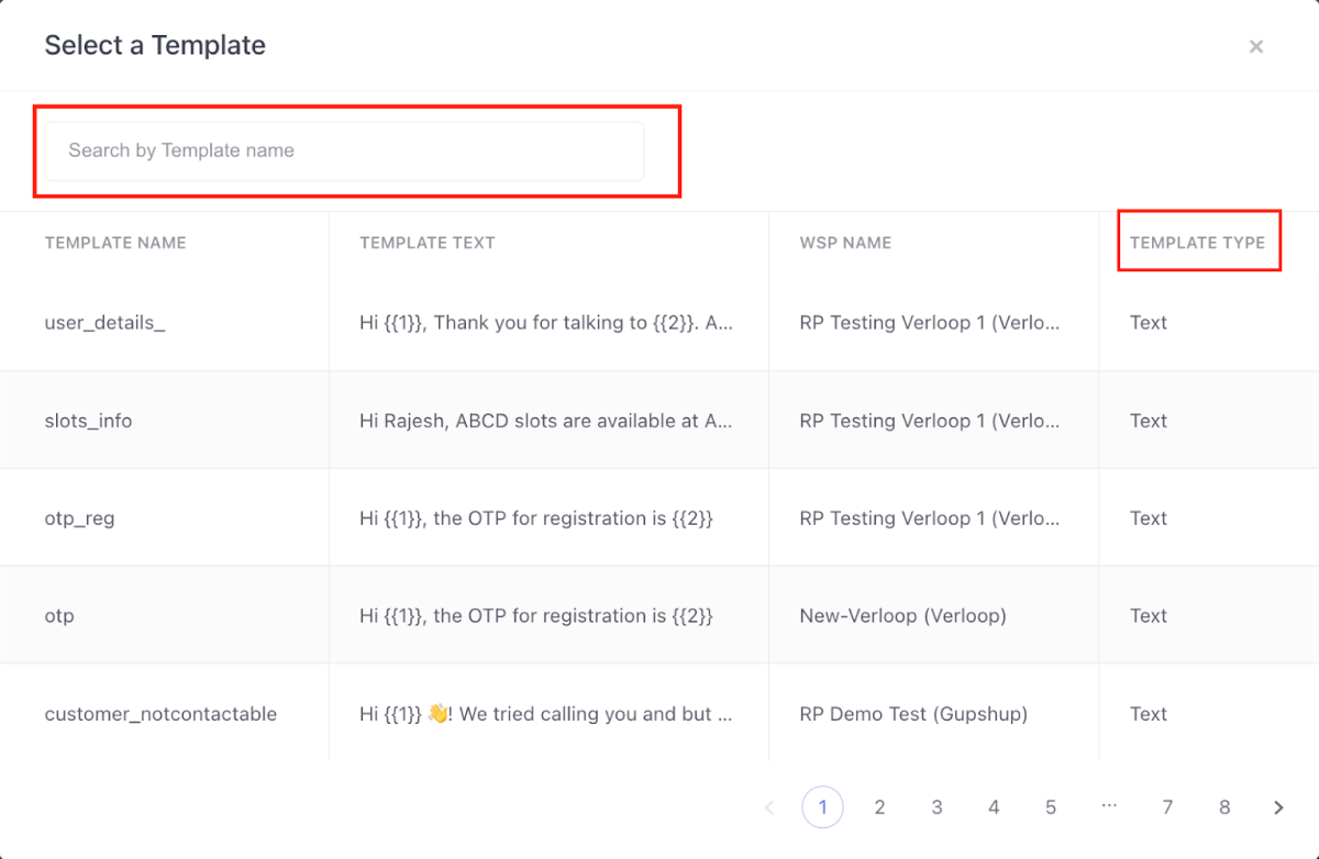 Easily find a WhatsApp message template by its name and view its type while selecting a template.