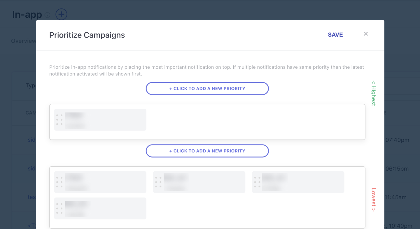 If multiple campaigns are eligible to be shown to a user on a particular screen, in that case, you can now decide your own priority amongst those campaigns by using a drag-and-drop interface as shown below.