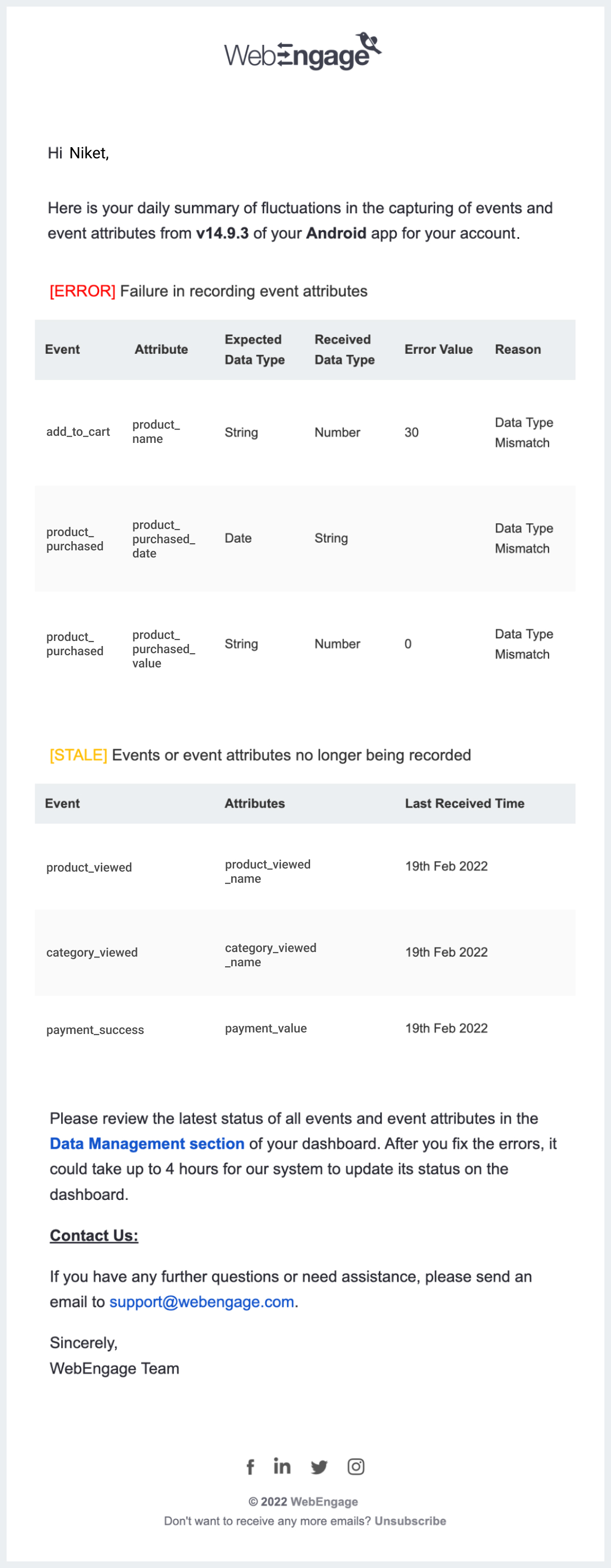 You can opt-in to a daily email alert summarizing the issues in the event integration of your project. Here’s a sample email:
