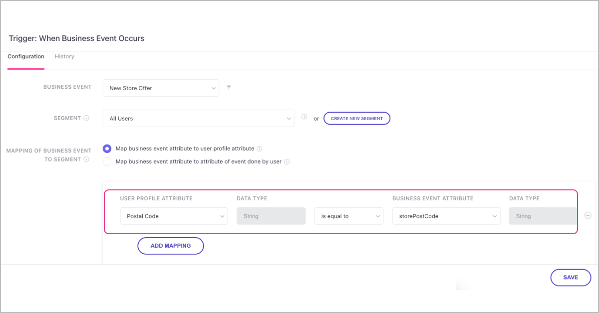 You can now map system user attributes (example: Postal Code) to your business event to trigger a Relay.