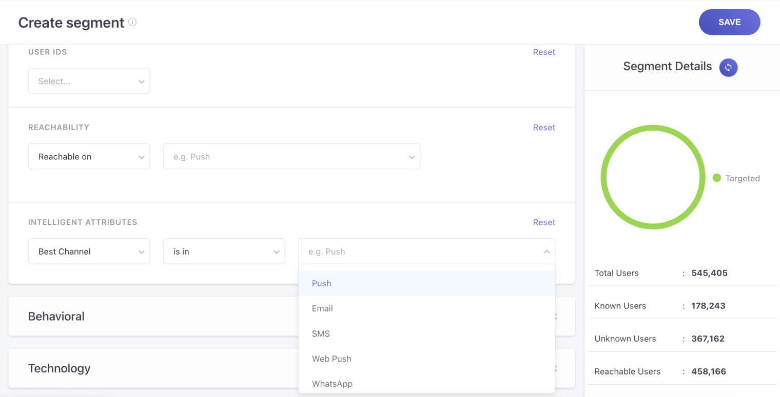 The WebEngage system intelligently decides the best channel to send a campaign to the user, depending on their past activity. “Best Channel” is an intelligent user attribute that can be used for segmentation and journeys, the value of which would be refreshed periodically.