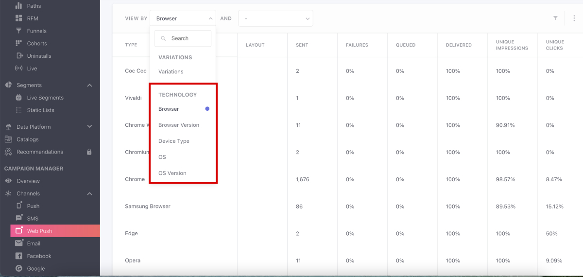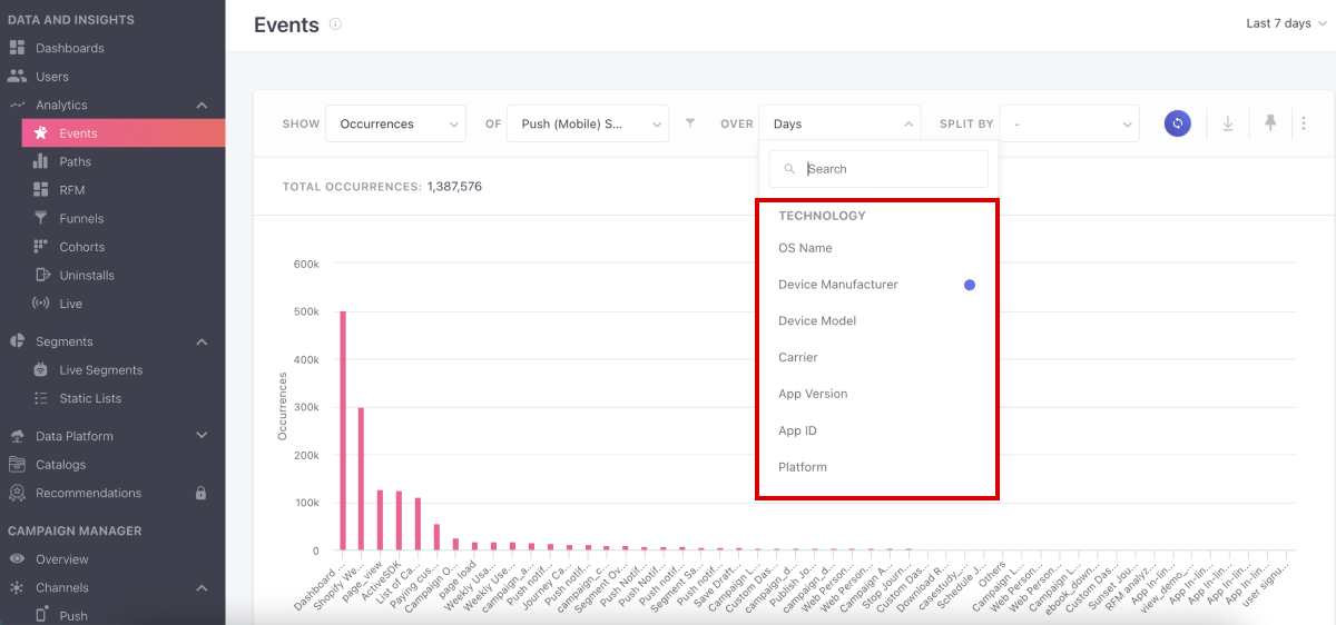 We have added various attributes like model, manufacturer, etc. to allow you to analyze these events better. These attributes are available under various analytics sections (Events, Paths, Funnels, Cohorts) as well as on the Overview/Analyze page of a campaign.