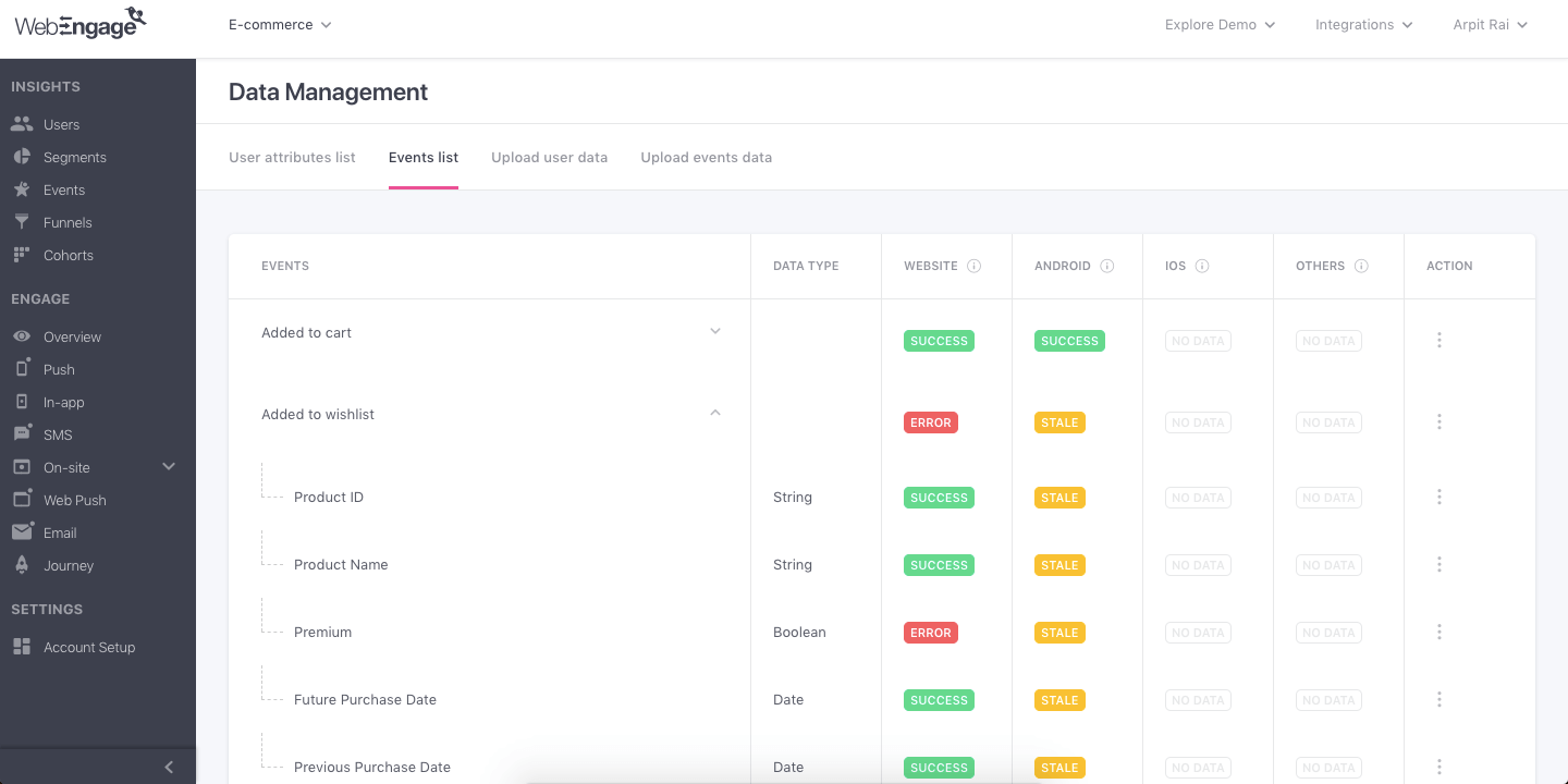 We’ve been wanting to build a solution to this problem for a really long time. In addition to the customer delight, this feature also brings a lot of joy to our customer success teams who in the past have had to scramble to resolve these issues with customers. With our new release today, you will be able to track in-depth the status of the data about your users and events that you’re sending to us from your website, mobile apps, and REST API. You can also change the data type of attribute in WebEngage and you can also stop tracking certain attributes and events.