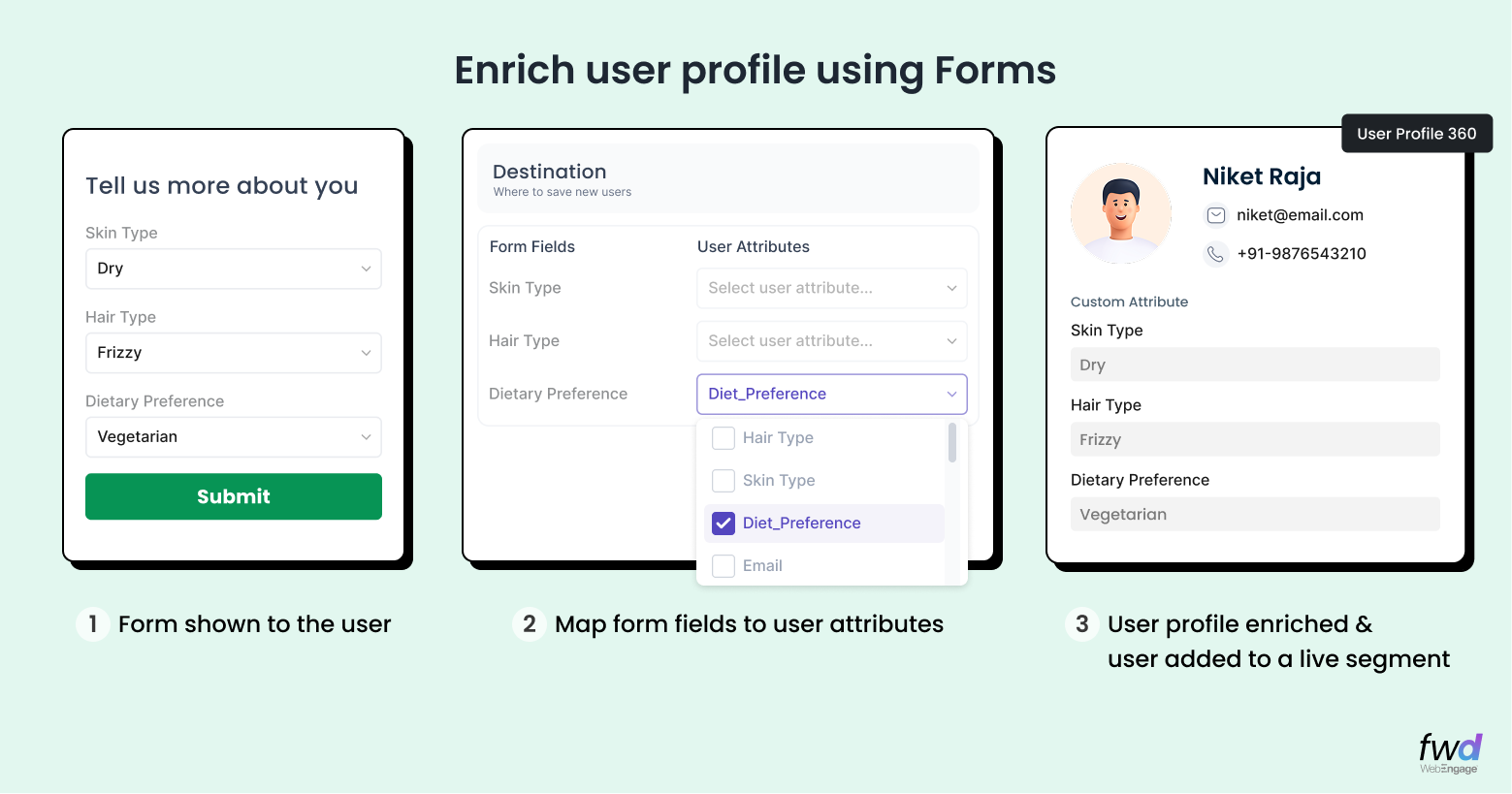 With our Form Support, you can drag input fields directly into your notifications. Capture emails, phone numbers, or even zero-party data like product preferences (e.g., “What skin type are you?”). This data isn’t just stored; it enriches the user profile in real-time, fueling your downstream personalization strategies.
