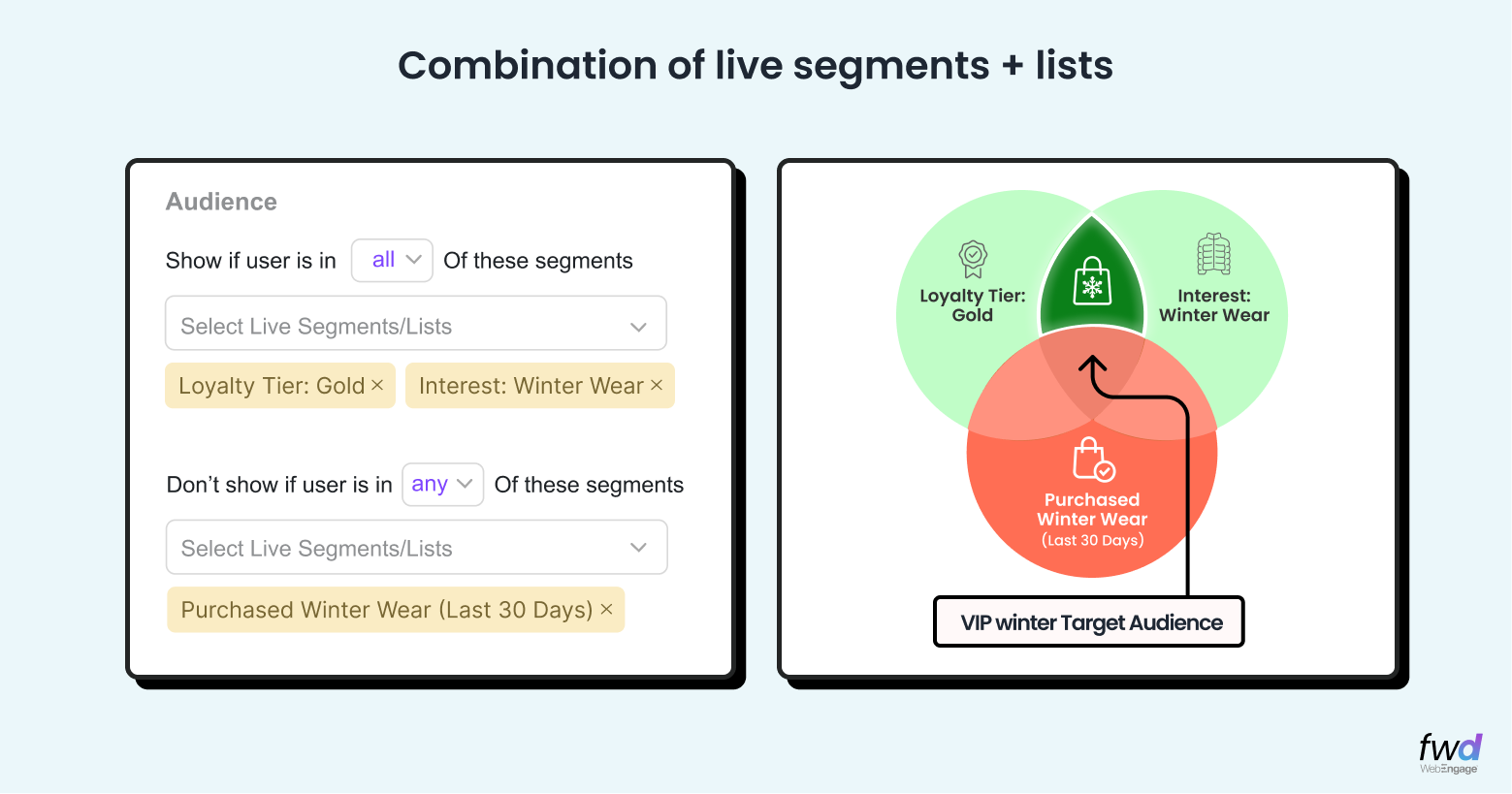 - Segment Inclusion/Exclusion: Go beyond basic rules. You can now target multiple live segments simultaneously (e.g., “Include: High Value Users” + “Exclude: Users who bought in the last 7 days”) to ensure the right message hits exactly the right audience.