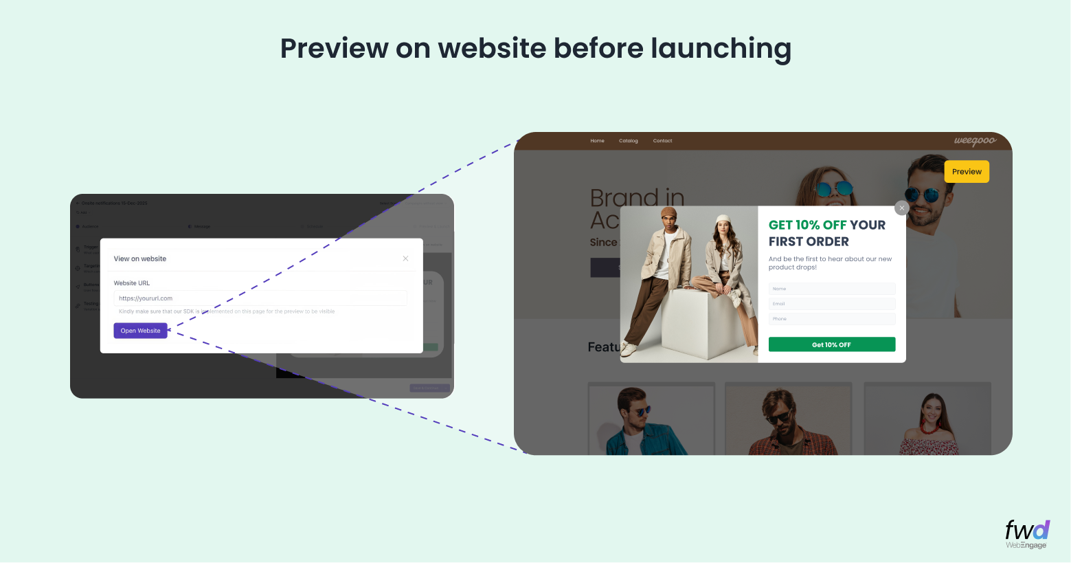We’ve added a “Preview on Website” feature. With a single click, you can generate a live preview link that overlays your campaign on your actual website URL. Check the look, feel, and triggers in a real-world environment before you show it to your customers.