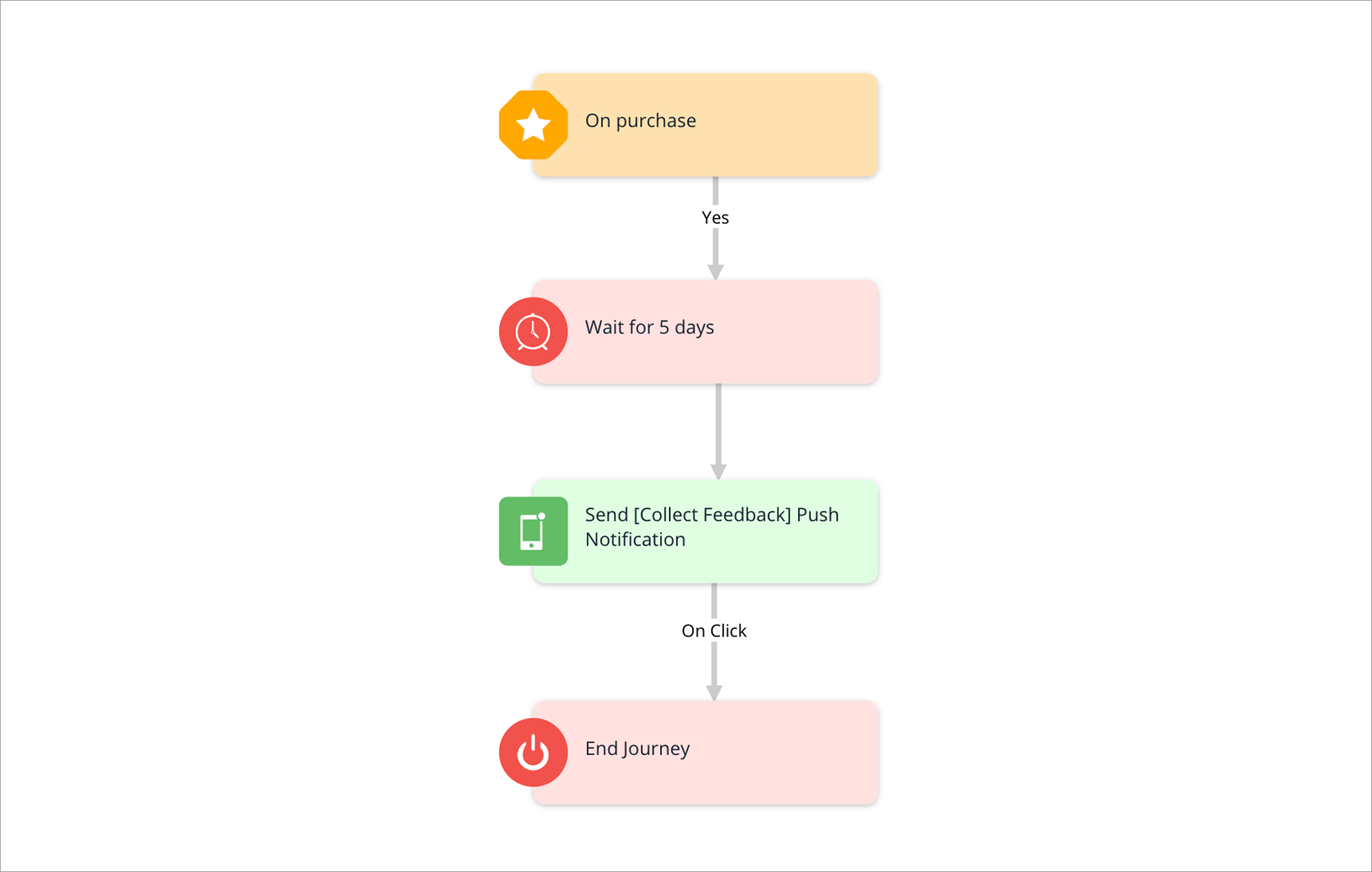 As it is quite evident, in the above journey(workflow) we are triggering the feedback push on the delay of 5 days after purchase.