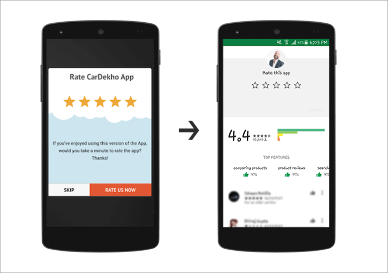 - Popping an in-app message only to request feedback is damaging to UX. Also, the results wouldn’t be totally reliable as the user’s rating will be highly influenced by his current behavior.