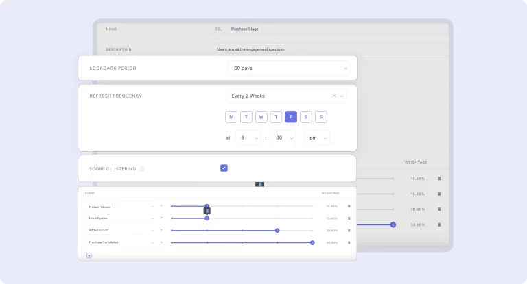 This advanced tool helps you dive deeper into each customer’s interactions with your brand. Assign weightage from 1 to 5 to critical events basis their importance. Our system will then calculate a precise user engagement score on a scale of 1 to 10. Scores close to 10 indicate higher engagement, while scores closer to 1 indicate lower engagement.