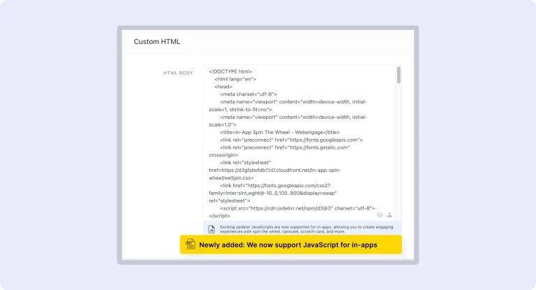 Enhance your in-app notifications with JavaScript for dynamic, interactive experiences. The expanded 10,000-character HTML limit allows for greater creativity and customization, enabling you to deliver engaging content and personalized messages. This feature empowers developers to create rich, immersive notifications that captivate and retain users effectively.