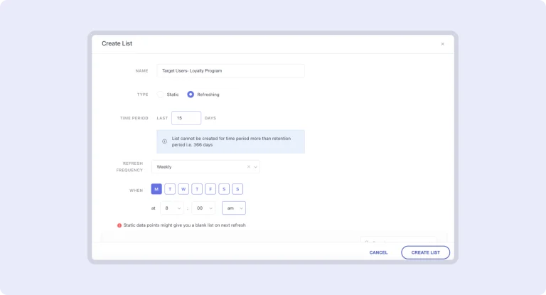 Say goodbye to manual updates! Export your RFM data to dynamic lists that refresh automatically based on your criteria. Keep your campaigns relevant and up-to-date with minimal effort—experiment and launch with ease!
