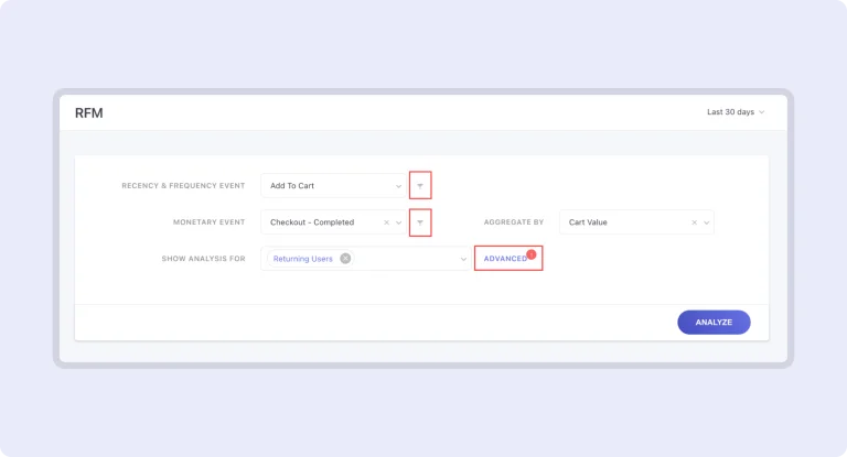 Our RFM Analysis tool now features advanced filters for event attributes, user attributes, and segments. Tailor your data analysis with precision to target the right users and streamline your campaigns effortlessly.