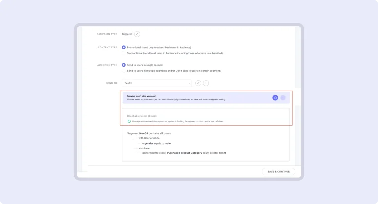 You can now send one-time campaigns without waiting for segment brewing! This enhancement allows you to launch campaigns via email, SMS, WhatsApp, web push, or Mobile Push even when the targeted segment is in the “In Progress” state.