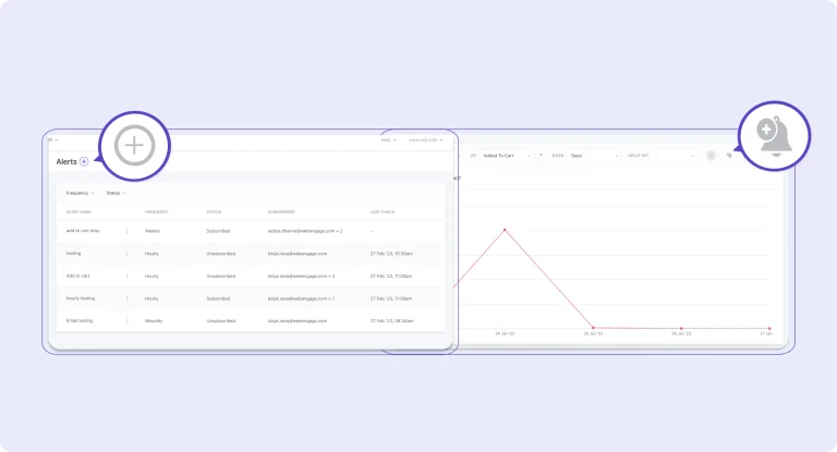 Set up alerts for specific events you want to track and monitor important metrics closely. Receive instant notifications whenever there’s a deviation from your set thresholds, ensuring you never miss a critical change. Multiple users can subscribe to the same alert, and you can even mute alerts to reduce noise.