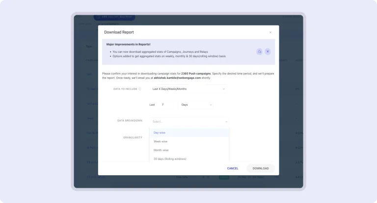 - Flexible Timeframes: Download reports broken down by day, week, month, or a rolling 30-day window, for more insight into your campaigns and journeys. This makes it easier to track and compare data, especially for ‘Unique’ metrics.