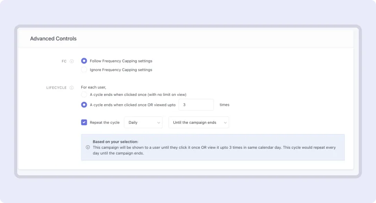With this update, configure how many times a campaign should be displayed until clicked and set it to recur on a schedule (hourly, daily, weekly, or monthly). You can also specify how many times the cycle should repeat or let it run until the campaign ends. This feature requires SDK updates: Android v4.6.0, iOS v6.5.0.