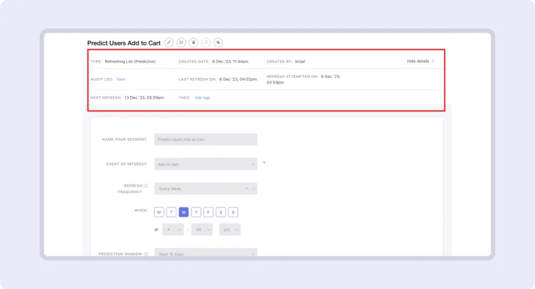 - Details Section: Dive deep into predictive segment metadata with data points such as created date, last refresh date, and scheduled next refresh date.