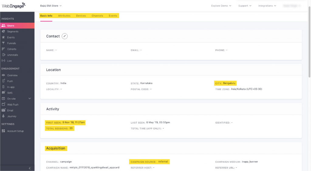 The first step to fixing a leaky funnel was to know the source of the leaks. For this, WebEngage built a robust user infrastructure, by capturing every user’s data and tracking their movements across various sessions. As all this data flowed into the database, it created a detailed and in-depth profile of each user on the WebEngage dashboard.