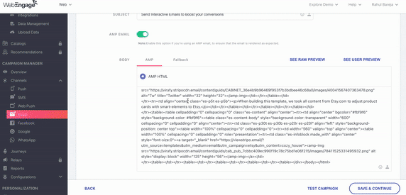 1. Provide special offers and promotions to users with low engagement scores to prevent them from churning, and 2. Cross-sell and up-sell to users with high engagement scores, as they are more likely to engage and make repeat purchases. Sounds useful? Reach out to us at product@webengage.com or get in touch with your Customer Success Manager to enable this feature. Change 🟡 Your Email Marketing TacticsTo stay relevant in the email marketing game, writing emails that catch the reader’s attention and encourage users to engage with them actively is crucial. Additionally, interactive emails help you gain valuable insights into your users’ preferences. You can now achieve just that with our AMP for email feature. AMP for emails allows you to serve live, interactive content and create a website-like experience- in an email! To learn more about AMP for emails, read our knowledge base.