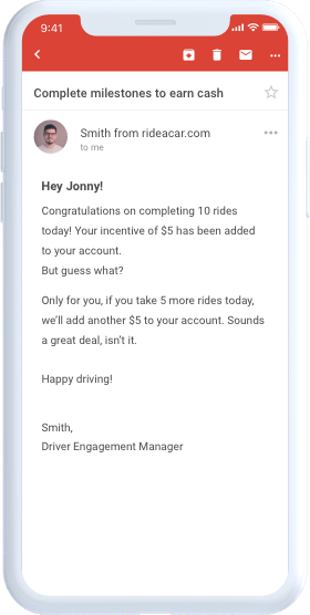 An incentive program that can encourage your drivers to complete milestones related to taking more rides or getting more 5-star reviews can be a big stimulus for them. And what better way to do that than an intelligent automation platform to automate all your communications related to milestones, reminders and rewards.